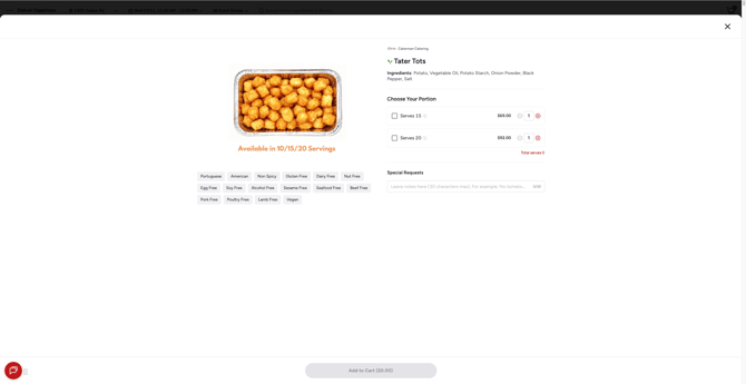 Serves 20— $104.00 - Adjust the quantity for each portion with +/- buttons