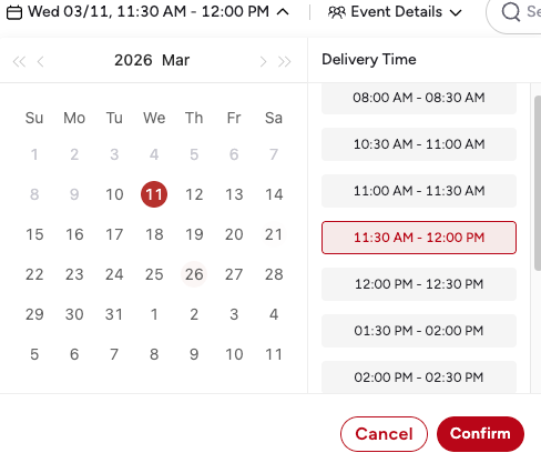 - Set the delivery date and time — click the date at the top and pick a specific 30-minute window (e.g., 11:30 AM – 12:00 PM).