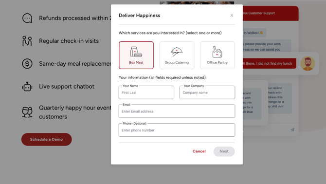 For group orders or catering, see Ordering & Menu. If issues arise, use live chat or email support@webox.com.