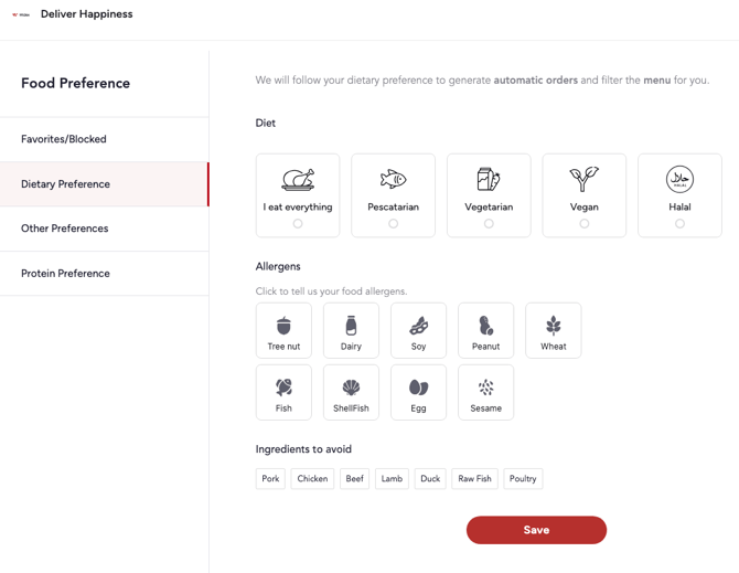 - Set your preferences: Go to Account → Food Preferences to select dietary needs (e.g., vegan, keto), allergens (e.g., nuts, dairy), and avoided ingredients (e.g., onion, garlic). This enables personalized recommendations and auto-orders.