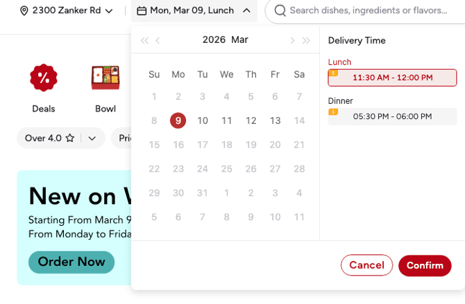 - Select your meal: Choose the date (up to 7 days ahead), meal period (Lunch or Dinner—menus update accordingly), and address.