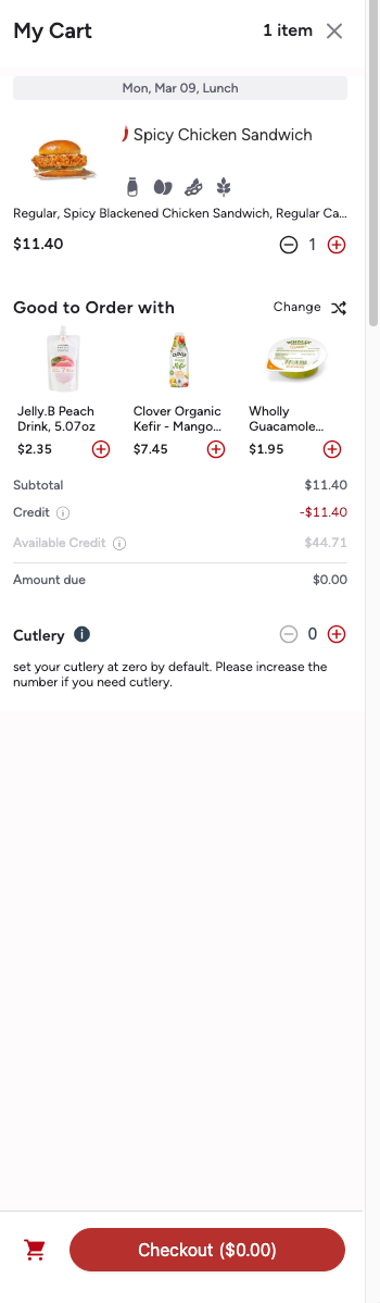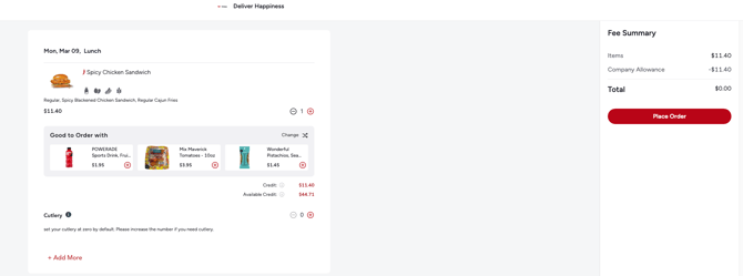 - Review cart: Adjust quantities, see budget breakdown (company allowance applied first), fees (tax, service, delivery), and remaining balance (daily/weekly/monthly limits).
