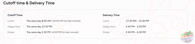 - Same-day lunch: Before 8:00 AM (some brands cutoff at 8:30 AM; last-minute fees may apply 8:00-10:00 AM).